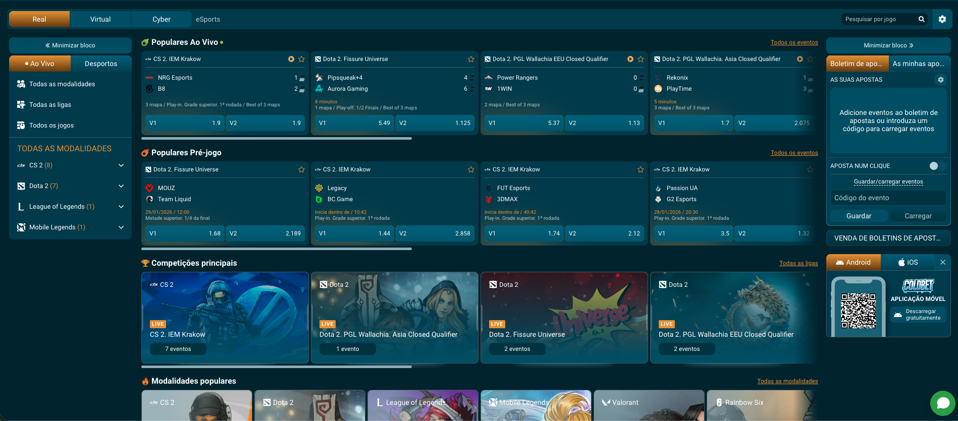 Dentro de eSports, a ColdBet separa a oferta por formato. Real é competição e torneios, Virtual é aposta rápida em eventos digitais e Cyber é liga de alta frequência. Esta divisão aparece logo no topo da secção para não perderes tempo a procurar.